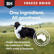 Black Hawk Freeze Dried Dog Treats are made in Tasmania, Australia, from 100% kangaroo and are suitable for all dogs. Our premium treats are made from wild sourced kangaroo with no artificial preservatives.