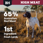 Black Hawk High Meat Australian Red Meat is a premium, high-protein diet designed to echo the natural prey diet of dogs’ wild ancestors. Featuring 65% fresh Australian lamb, as well as beef and pork, this complete and balanced recipe provides high-quality protein for strong bones and muscles. It also delivers essential minerals like iron, zinc and copper to support healthy body functions and overall wellbeing. 100% free from poultry ingredients, for those dogs that may have a sensitivity to poultry or prefer the flavour of red meats.