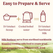 Di-Vetelact Milk Supplement for Animals provides a balanced blend of 25 vitamins and minerals, prebiotics, and 18 essential amino acids to support optimal health at every stage of life. Formulated with Australian and New Zealand dairy, this low-lactose nutritional milk optimizes nutrient absorption and utilization. Ideal as a complete milk replacer for orphaned or early-weaned animals, it also serves as a comprehensive supplement for pre-natal, pregnant, lactating, growing, aging, convalescing, and performance animals. Ensure your animal’s vitality and well-being with Di-Vetelact’s expertly balanced nutrition.