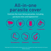 Controls the main feline parasites, including fleas, paralysis ticks, tapeworms and lungworms