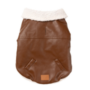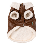 Channeling classic aviator style, the Aviator Jacket wraps your pet in warmth and vintage charm. Crafted with a sleek faux leather outershell and cosy sherpa lining, this piece blends function with timeless style. Gold-tone snap buttons, sherpa-trimmed armholes, and two faux pockets complete the look—perfect for pets with a flair for adventure. Available in brown.