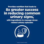 Hill's Prescription Diet c/d Multicare Stress Urinary Care cat food is clinical nutrition specially formulated to support your cat's urinary health while also managing stress. It is a stress relief cat food clinically proven to lower the recurrence rate of the most common urinary signs by 89%. This wet cat food is made with chicken and has a mouthwatering taste that your cat will love.