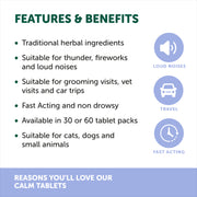 Calm tablets provide convenient dosage control. They are crushable to be dissolved in liquid if you prefer a liquid form or can be given with food. Suitable for dogs, cats and small animals.