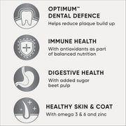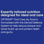 OPTIMUM Oral Care is formulated with the Dental Defence System to help reduce plaque build-up and protect teeth and gums. The formula uses the mechanical action of chewing dry kibble, combined with sodium tripolyphosphate, to enhance oral hygiene. It includes antioxidants for immune health, prebiotics for digestive well-being, and high levels of chicken for heart health, providing a natural source of arginine and vitamin E to support blood circulation and cardiac function. Additionally, this range is enriched with zinc and omega 6 for optimal skin and coat health. To reduce litter box odour, the food contains added Yucca Extract, making it a comprehensive nutritional choice for adult cats.