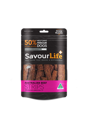 SavourLife’s delicious Australian Beef Strips contain no artificial flavours or colours and are made from real Australian meat. They are enriched with essential vitamins and minerals for better health and the addition of fish oil gives a natural boost of vital Omega 3 & 6, which is perfect for a shiny, healthy coat. We use a special drying process to capture the natural goodness and their naturally chewy texture is great for promoting healthy teeth and gums. A delicious treat for dogs of all shapes and sizes. SavourLife is a family-owned and operated Australian company, they produce Australian-made dog food and donate 50% of their profits to pet rescue organisations; helping them save and re-home abandoned dogs.