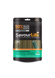 SavourLife’s Australian Natural Dental Bars are scientifically designed to be the perfect addition to your dog’s dental health routine. SavourLife’s unique, triple-ridge design delivers double the cleaning grooves and helps clean teeth and gums, reduce plaque and freshen breath, by gently cleaning teeth and massaging gums. Made in Australia, with a focus on natural ingredients including real Australian Kangaroo, SavourLife’s Natural Dental Bars are gluten free and contain no artificial flavours or colours. They are enriched with 19 vitamins and mineral plus Vitamin C and Zinc; which together may help reduce plaque and tartar formation, support healthy gum tissue and control bad breath. As added benefits they also contain mint and parsley, known breath fresheners and are also low in fat and salt. With a taste that dogs love, they are designed for daily consumption and this size is perfect for small to medium size dogs under approx. 22.5kg. They are a perfect complement to a complete oral care routine to give your dog the best dental hygiene and the freshest breath! SavourLife is a family-owned and operated Australian company, they produce Australian-made dog food and donate 50% of their profits to pet rescue organisations; helping them save and re-home abandoned dogs.